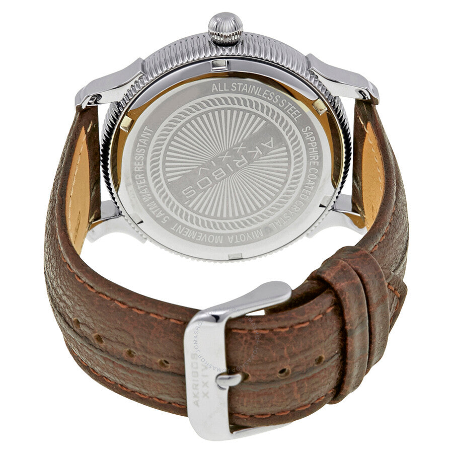 Stainless steel case with a brown leather strap. Fixed stainless steel bezel. Black matte dial with luminous silver-tone hands and index hour markers. Minute markers around the outer rim. Dial Type: Analog. Luminescent hands and hour markers. Day of the week and date display at the 3 o'clock position. Quartz movement. Scratch resistant mineral with a sapphire coating crystal. Pull / push crown. Screw down case back. Round case shape. Case size: 42 mm. Case thickness: 13 mm. Band width: 21 mm. Band length: 8.5 inches. Tang clasp. Water resistant at 50 meters / 165 feet. Functions: date, day, hour, minute, second. Casual watch style. Watch label: Hong Kong. Akribos XXIV Black Dial Brown Leather Men's Watch AK726BR.