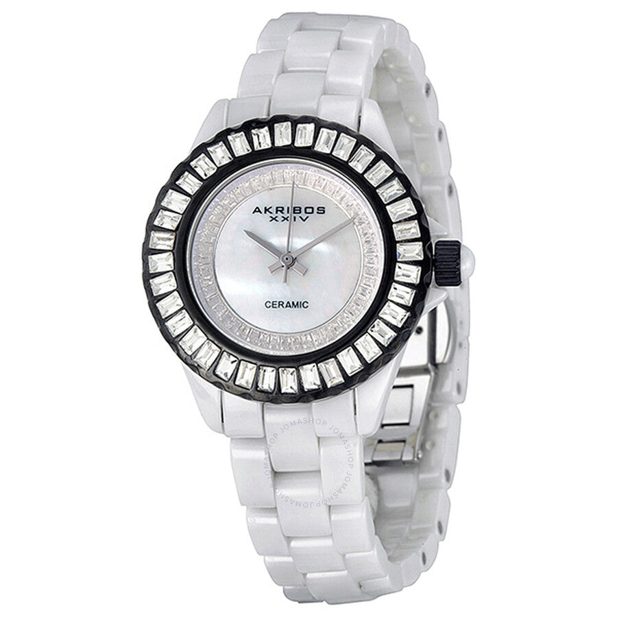 White ceramic case with a white ceramic bracelet. Fixed black-tone bezel set with baguette crystals. White mother of pearl (crystal-set) dial with silver-tone hands. No markers. Dial Type: Analog. Luminescent hands. Quartz movement. Scratch resistant mineral with a sapphire coating crystal. Screw down crown. Screw down case back. Round case shape. Case size: 34 mm. Case thickness: 11.2 mm. Band width: 15 mm. Band length: 8.5 inches. Butterfly clasp. Water resistant at 10 meters / 33 feet. Functions: hour, minute, second. Ceramic Series. Dress watch style. Akribos XXIV Ceramic White Mother of Pearl Dial Ladies Watch AK518BKW.