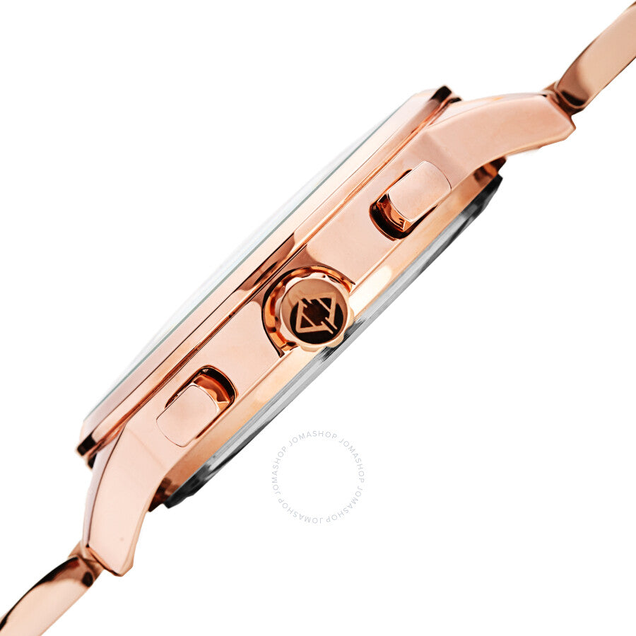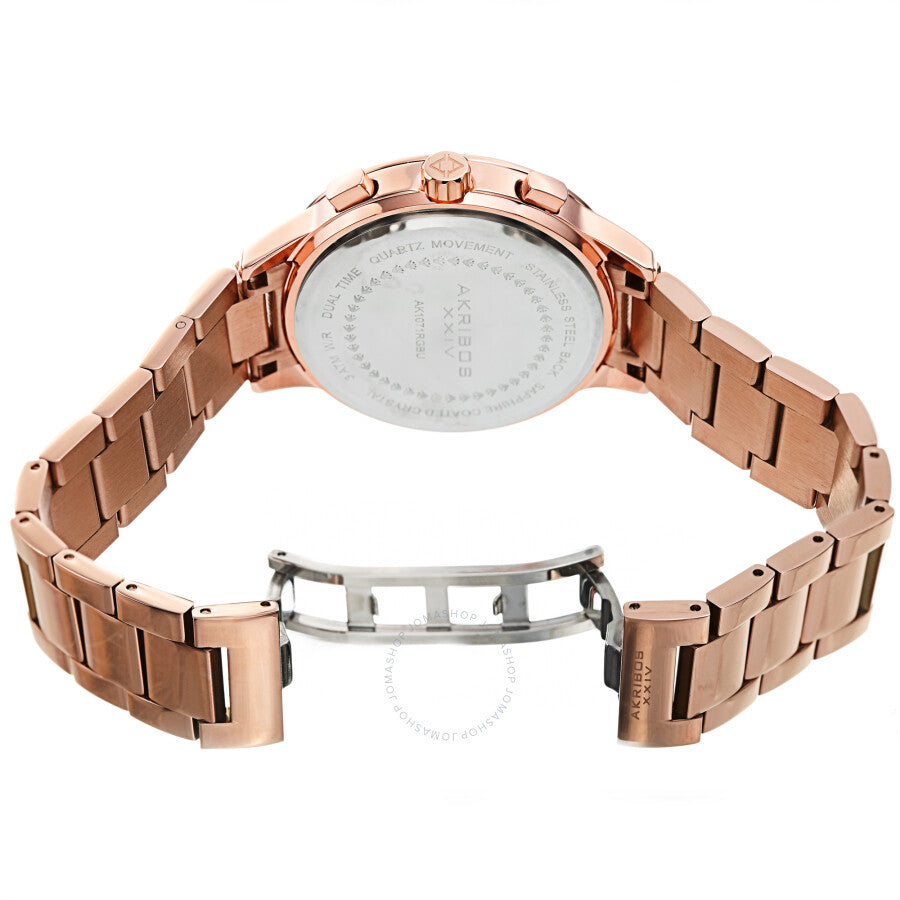 Rose gold-tone composite metal case with a rose gold-tone stainless steel bracelet. Fixed rose gold-tone composite metal bezel. Blue dial with rose gold-tone hands and Arabic numeral hour markers. Minute markers. Arabic numeral minute markers (at 5 minute intervals). 24 hour (GMT) around the outer rim. Dial Type: Analog. Date display at the 3 o'clock position. Two silver sub-dials displaying: 24 hours and 24 hours. Quartz movement. Scratch resistant mineral crystal. Pull / push crown. Solid case back. Round case shape. Case size: 43 mm. Case thickness: 11.5 mm. Band width: 18 mm. Band length: 8.5 inches. Butterfly clasp. Water resistant at 30 meters / 100 feet. Functions: chronograph, hour, minute, second. Fashion watch style. Akribos XXIV Chronograph Blue Dial Men's Watch AK1071RGBU.