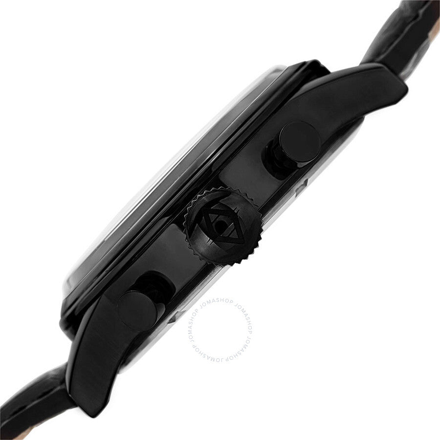 Black-plated stainless steel case with a black leather strap. Fixed black-plated bezel. Black dial with silver-tone Breguet-style hands and Arabic numeral hour markers. Minute markers. 24 hour markers around the outer rim. Dial Type: Analog. Date display at the 3 o'clock position. Chronograph - three sub-dials displaying: 60 second, 60 minute and 1/10th of a second. Quartz movement. Scratch resistant mineral crystal. Pull / push crown. Solid case back. Round case shape. Case size: 44 mm. Case thickness: 14 mm. Band width: 22 mm. Band length: 7.5 inches. Tang clasp. Water resistant at 50 meters / 165 feet. Functions: chronograph, date, hour, minute, second. Casual watch style. Watch label: Japan Movt. Akribos XXIV Chronograph Quartz Black Dial Men's Watch AK798BK.