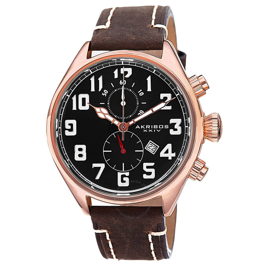 Rose gold-tone stainless steel case with a brown leather strap. Fixed rose gold-tone bezel. Black matte dial with luminous rose gold-tone hands and Arabic numeral hour markers. Minute markers around the outer rim. Dial Type: Analog. Luminescent hands and hour markers. Date display at 4 o'clock position. Chronograph - two sub-dials displaying: 60 second and 60 minute timer. Quartz movement. Scratch resistant mineral crystal with sapphire coating. Pull / push crown. Screw down case back. Case diameter: 46 mm. Case thickness: 14.5 mm. Round case shape. Band width: 24 mm. Band length: 9 inches. Tang clasp. Water resistant at 50 meters / 165 feet. Functions: chronograph, date, hour, minute, second. Casual watch style. Watch label: Hong Kong. Akribos XXIV Essential Chronograph Black Dial Brown Leather Men's Watch.