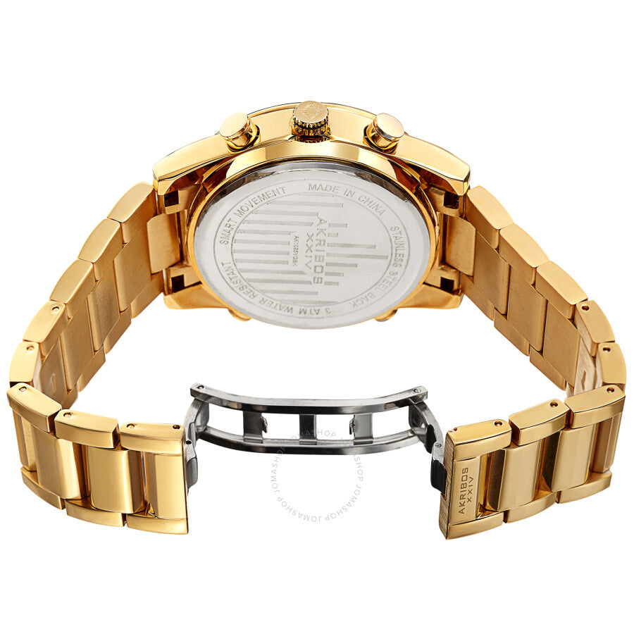 Yellow gold-tone composite metal case with a yellow gold-tone stainless steel bracelet. Fixed gold-tone composite metal bezel. Black dial with luminous yellow gold-tone hands and alternating Roman numeral & index hour markers. Tachymeter scale around the outer rim. Dial Type: Analog-digital. Luminescent hands. Digital calendar. Quartz movement. Scratch resistant Hardlex crystal. Pull / push crown. Solid case back. Round case shape. Case size: 45 mm. Case thickness: 14.5 mm. Band width: 24 mm. Band length: 8.5 inches. Hidden clasp. Water resistant at 30 meters / 100 feet. Functions: date, hour, minute, second, tachymeter. Sport watch style. Watch label: Made in China. Akribos XXIV Quartz Black Dial Men's Smart Watch AK1095YGBK.