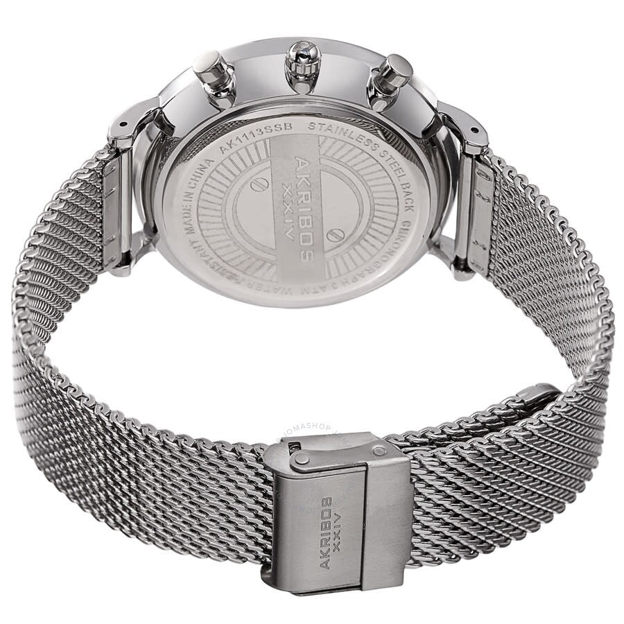 Silver-tone composite metal case with a stainless steel mesh bracelet. Fixed silver-tone composite metal bezel. Black dial with silver-tone pencil-style hands and dot hour markers. Minute markers around the outer rim. Dial Type: Analog. Luminescent hands and markers. Chronograph - four sub-dials displaying: 60 second, 60 minute, 24 hour and 1/10th of a second. Quartz movement. Scratch resistant hardlex crystal. Pull / push crown. Solid case back. Round case shape. Case size: 42 mm. Case thickness: 9.5 mm. Band width: 20 mm. Fold over slip through clasp. Water resistant at 30 meters / 100 feet. Functions: hour, minute, second. Sport watch style. Akribos XXIV Quartz Black Dial Men's Watch AK1113SSB.