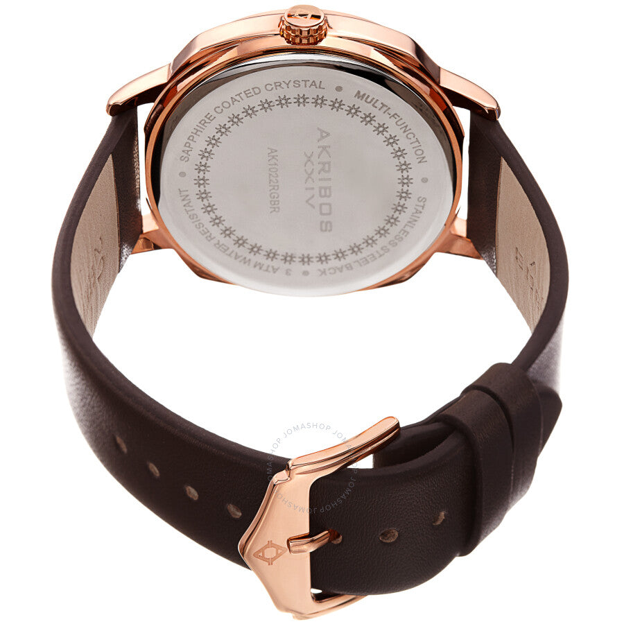 Rose gold-tone composite metal case with a brown leather strap. Fixed rose gold-tone bezel. Blue dial with luminous rose gold-tone hands and index hour markers. Arabic numeral minute markers (at 5 minute intervals). Minute markers around the outer rim. Dial Type: Analog. Luminescent hands. Date display at the 6 o'clock position. Two multi-function sub-dials displaying: date and 24 hour. Quartz movement. Scratch resistant mineral crystal. Pull / push crown. Solid case back. Cushion case shape. Case size: 42 mm. Case thickness: 11 mm. Band width: 20 mm. Band length: 8 inches. Tang clasp. Water resistant at 30 meters / 100 feet. Functions: GMT, second time zone, date, hour, minute, second. Fashion watch style. Akribos XXIV Quartz Blue Dial Brown Leather Men's Watch AK1022RGBR.