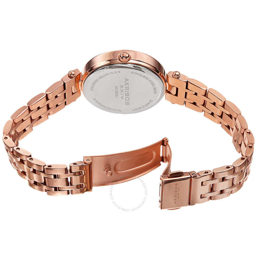 Rose gold-tone composite metal case with a rose gold-tone stainless steel bracelet. Fixed rose gold-tone bezel. Blue dial with rose gold-tone pancil-style hands and Swarovski crystal hour markers. Dial Type: Analog. Quartz movement. Scratch resistant mineral crystal. Pull / push crown. Solid case back. Round case shape. Case size: 32 mm. Case thickness: 7.5 mm. Band width: 14 mm, band length: 8 inches. Fold over clasp. Water resistant at 30 meters / 100 feet. Functions: hour, minute. Fashion watch style. Akribos XXIV Quartz Crystal Blue Dial Ladies Watch AK1085BU.