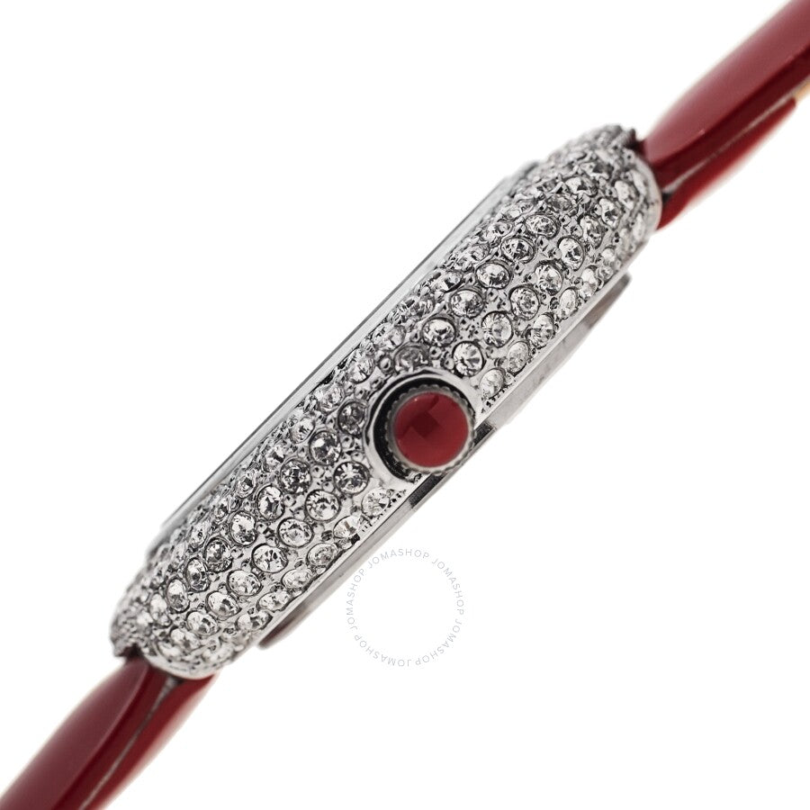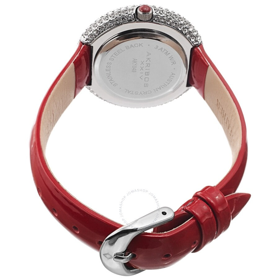 Silver-tone brass case set (all over) with Swarovski crystals with a red leather strap. Fixed silver-tone brass bezel set with Swarovski crystals. White dial with silver-tone hands. No markers. Dial Type: Analog. Quartz movement. Scratch resistant mineral crystal. Pull / push crown. Solid case back. Round case shape. Case size: 36 mm. Case thickness: 8.2 mm. Band width: 14 mm. Band length: 7 inches. Tang clasp. Water resistant at 30 meters / 100 feet. Functions: hour, minute. Fashion watch style. Akribos XXIV Quartz Crystal White Dial Ladies Watch AK1049RD.