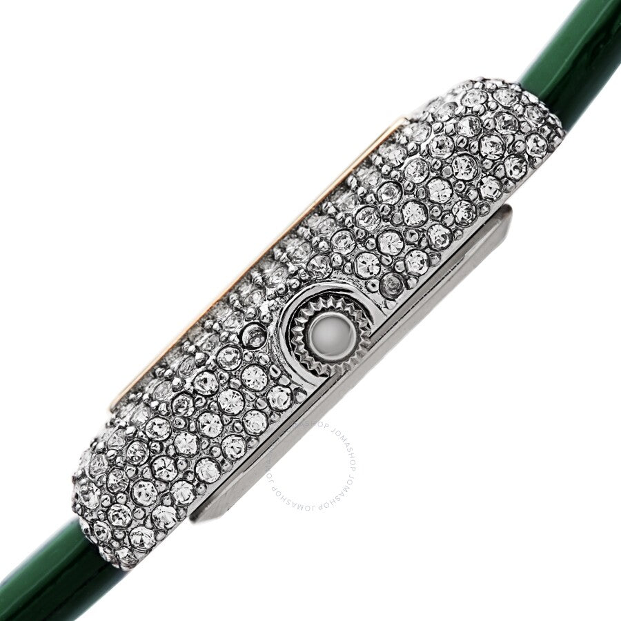Silver-tone brass set (all over) with Swarovski crystals with a green leather strap. Fixed rose gold-tone brass bezel set with Swarovski crystals. White dial with gold-tone alpha-style hands and index hour markers. Dial Type: Analog. Quartz movement. Scratch resistant mineral crystal. Pull / push crown. Solid case back. Rectangle case shape. Case size: 27 mm. Case thickness: 8 mm. Band width: 18 mm. Band length: 7.5 inches. Tang clasp. Water resistant at 30 meters / 100 feet. Functions: hour, minute, second. Fashion watch style. Akribos XXIV Quartz Crystal White Dial Ladies Watch AK1068GN.