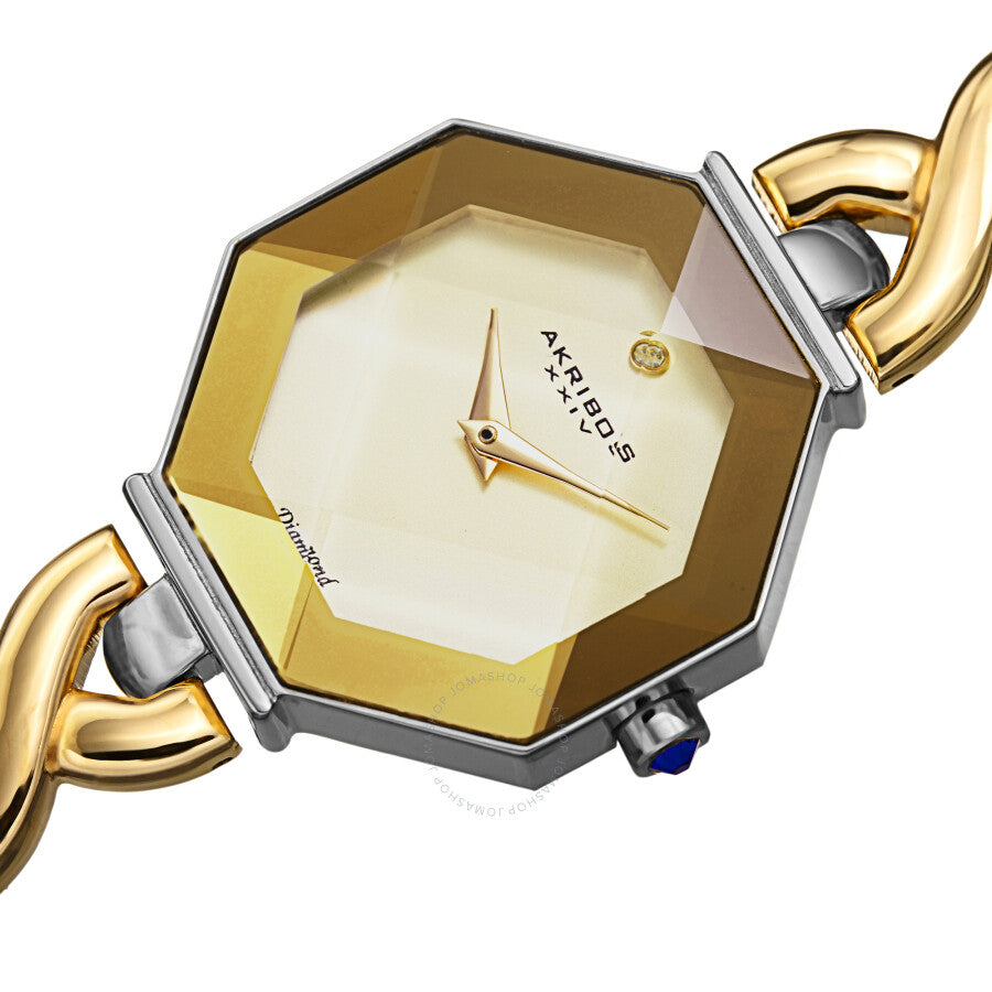 Gold-tone brass case with a gold-tone alloy bracelet with silver-tone links. Fixed gold-tone brass bezel. Gold dial with gold-tone dauphine-style hands. A single diamond is set at the 12 o'clock position. Dial Type: Analog. Quartz movement. Scratch resistant mineral crystal. Pull / push crown. Solid case back. Octagon case shape. Case size: 28 mm. Case thickness: 9 mm. Band width: 12 mm. Band length: 8.5 inches. Jewellery clasp. Water resistant at 30 meters / 100 feet. Functions: hour, minute. Fashion watch style. Akribos XXIV Quartz Diamond Gold Dial Ladies Watch AK1086TTG.