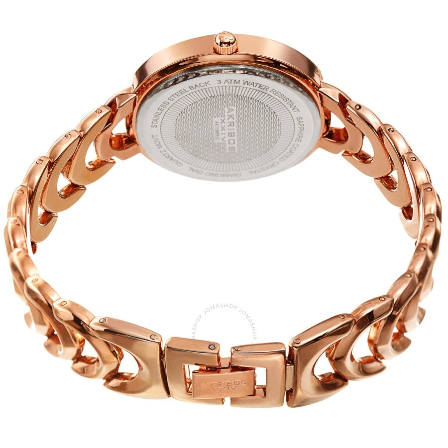 Rose gold-tone composite metal case with a rose gold-tone alloy bangle bracelet. Fixed rose gold-tone composite metal bezel. Silver (sandstone) dial with rose gold-tone leaf-style hands. Diamonds set at the 3, 6, 9 and 12 o'clock positions. Dial Type: Analog. Quartz movement. Scratch resistant mineral crystal. Pull / push crown. Solid case back. Round case shape. Case size: 36 mm. Case thickness: 9 mm. Band width: 16 mm. Band length: 8 inches. Jewellery clasp. Water resistant at 30 meters / 100 feet. Functions: hour, minute, second. Fashion watch style. Akribos XXIV Quartz Diamond Silver Dial Ladies Watch AK1088RG.