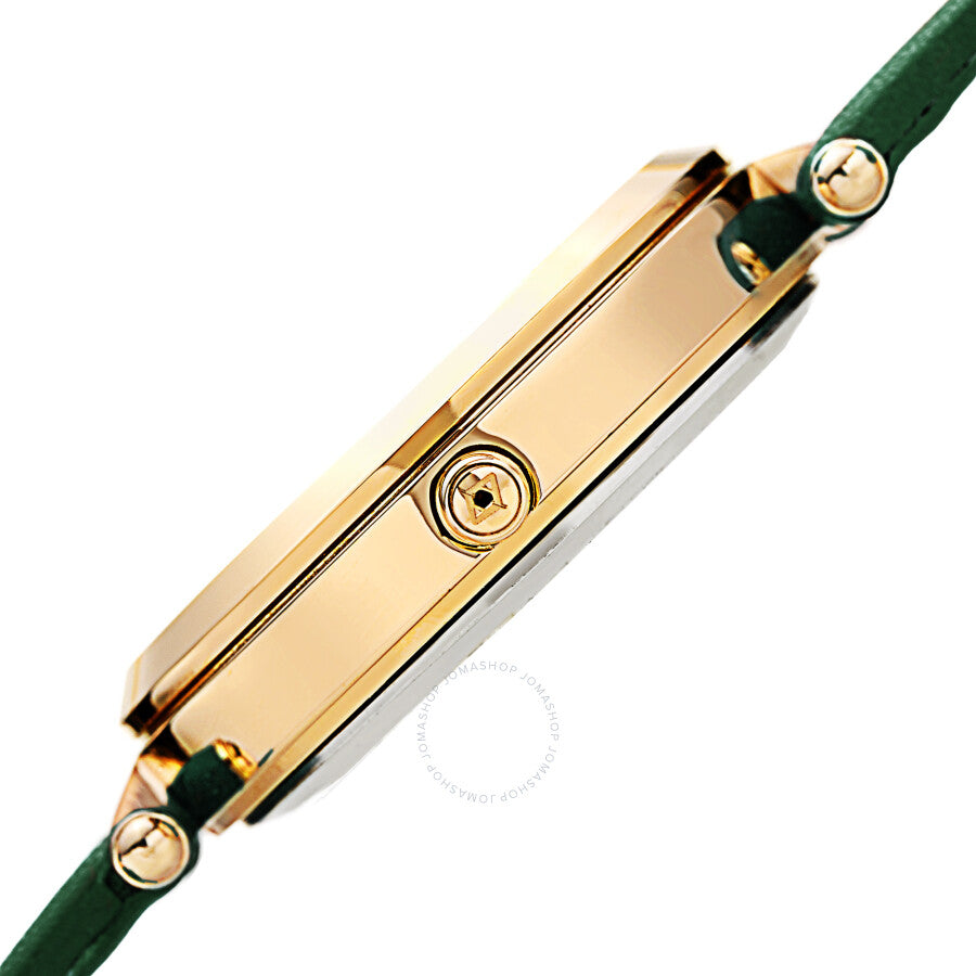 Gold-tone composite metal case with a green leather strap. Fixed gold-tone composite metal bezel. White (mother of pearl center) dial with gold-tone sword-shaped hands. A single diamond is set at the 12 o'clock position. Dial Type: Analog. Quartz movement. Scratch resistant mineral crystal. Pull / push crown. Solid case back. Round case shape. Case size: 34 mm. Case thickness: 8.8 mm. Band width: 16 mm. Band length: 7.5 inches. Tang clasp. Water resistant at 30 meters / 100 feet. Functions: hour, minute. Fashion watch style. Akribos XXIV Quartz Diamond White Dial Ladies Watch AK1069GN.