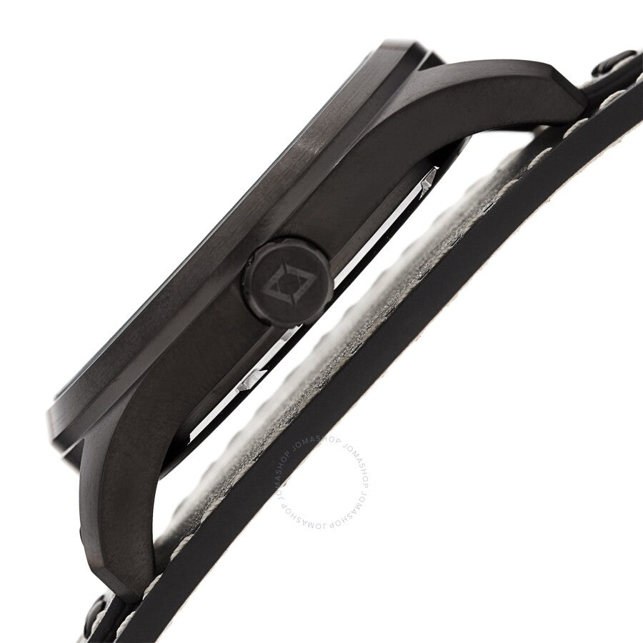 Black composite metal case with a black leather strap. Fixed black composite metal bezel. Grey dial with black leaf-style hands and small Arabic numeral hour markers. Arabic numeral minute markers (at 5 minute intervals). Minute markers around the outer rim. Dial Type: Analog. Luminescent hands and markers. Date display at the 3 o'clock position. Quartz movement. Scratch resistant mineral crystal. Pull / push crown. Solid case back. Round case shape. Case size: 46 mm. Case thickness: 14 mm. Band width: 40 mm. Band length: 8 inches. Buckle clasp. Water resistant at 50 meters / 165 feet. Functions: date, hour, minute, second. Fashion watch style. Akribos XXIV Quartz Grey Dial Men's Watch AK1024GN.