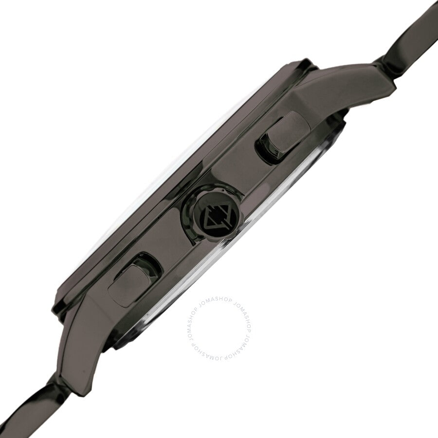Black composite metal case with a black-plated stainless steel bracelet. Fixed black composite metal bezel. Grey dial with silver-tone hands and Arabic numeral hour markers. Arabic numeral minute markers (at 5 minute intervals). Minute markers. 24 hour markers around the outer rim. Dial Type: Analog. Date display at the 6 o'clock position. Two silver sub-dials displaying: 24 hour and 24 hour (dual time). Quartz movement. Scratch resistant mineral crystal. Pull / push crown. Solid case back. Round case shape. Case size: 43 mm. Case thickness: 11.5 mm. Band width: 18 mm. Band length: 8.5 inches. Butterfly clasp. Water resistant at 30 meters / 100 feet. Functions: dual time, date, hour, minute, second. Fashion watch style. Akribos XXIV Quartz Grey Dial Men's Watch AK1071GN.