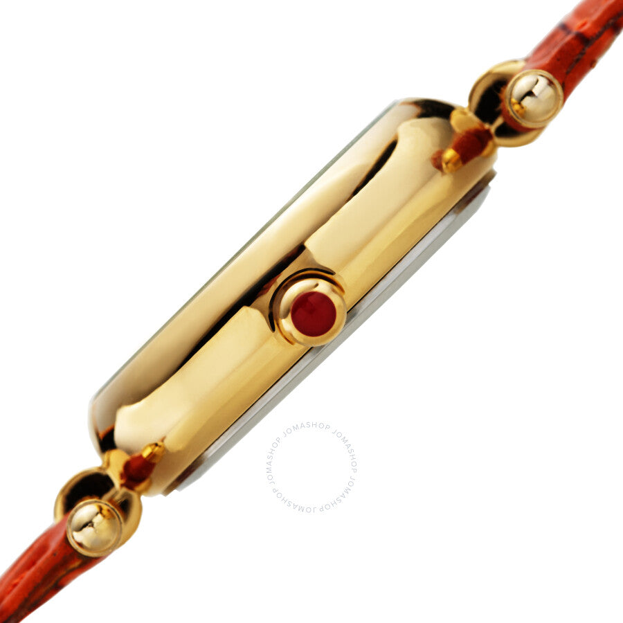 Yellow gold-tone composite metal case with a red leather strap. Fixed yellow gold-tone composite metal bezel. White dial with yellow gold-tone leaf-style hands and Roman numeral hour markers. Dial Type: Analog. Date display at the 6 o'clock position. Quartz movement. Scratch resistant mineral crystal. Pull / push crown. Solid case back. Round case shape. Case size: 35 mm. Case thickness: 8.8 mm. Band width: 16 mm. Band length: 7.5 inches. Tang clasp. Water resistant at 30 meters / 100 feet. Functions: date, hour, minute, second. Fashion watch style. Akribos XXIV Quartz White Dial Ladies Watch AK1070OR.