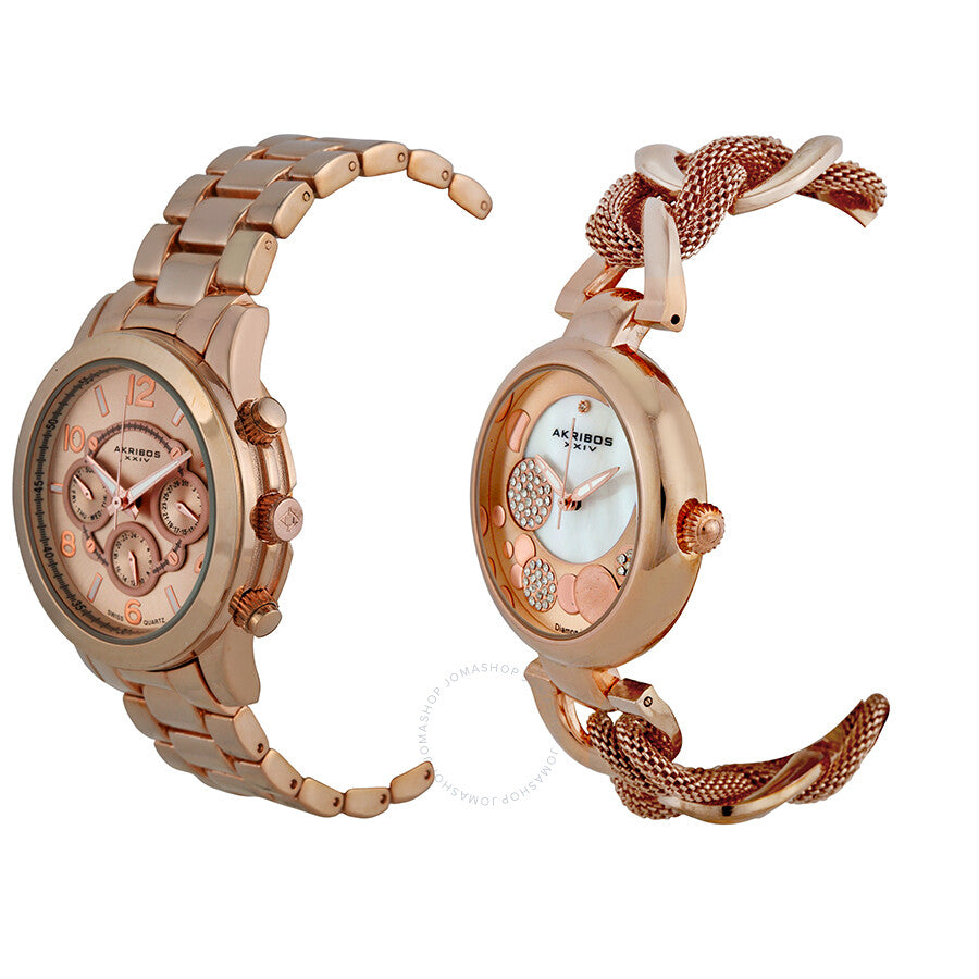 Rose gold tone stainless steel case with a rose gold tone stainless steel bracelet. Fixed bezel. AK648: rose gold tone dial AK643: mother of pearl center dial with diamonds. Luminous hands and AK648: alternating Arabic and index hour markers. Dial Type: Analog. Three - day of the week, date and 24 hour. Quartz movement. Scratch resistant mineral crystal. Pull / push crown. Case diameter: 40 mm. Round case shape. Water resistant at 10 meters / 33 feet. Functions: hour, minute, second, calendar, 24 hour . Additional Info: AK648: deployant clasp with push buttons. AK643: jewellery clasp. Dress watch style. Akribos XXIV Watch Set AK676RG.