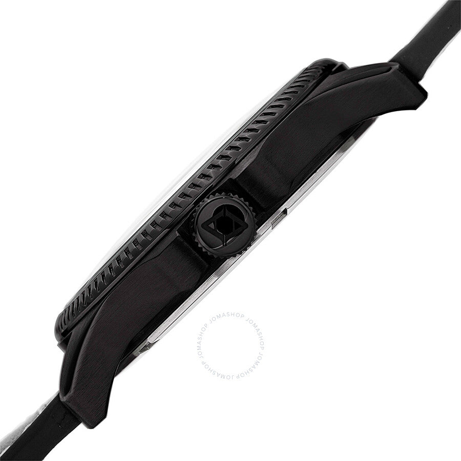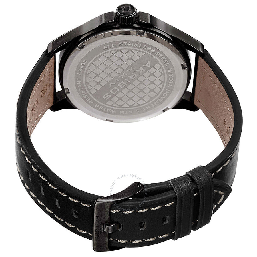 Black stainless steel case with a black leather strap. Fixed black bezel. Black dial with black with luminous fill hands and indexes and Arabic numeral hour markers. Minute markers around the outer rim. Dial Type: Analog. Luminescent hands and markers. Date display between 4 and 5 o'clock position. Quartz movement. Scratch resistant mineral crystal. Pull / push crown. Solid case back. Case size: 45 mm. Case thickness: 12 mm. Round case shape. Band width: 22 mm. Band length: 9 inches. Tang clasp. Water resistant at 50 meters / 165 feet. Functions: date, hour, minute, second. Casual watch style. Watch label: Japan Movt. Akribos XXIV Trek Black Dial Black Leather Men's Watch AK833WT.