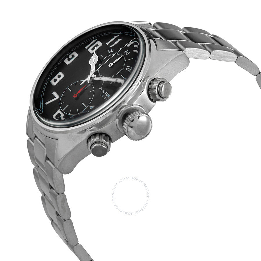 Stainless steel case with a stainless steel bracelet. Fixed stainless steel bezel. Black dial with luminous silver-tone hands and Arabic numeral hour markers. Minute markers around the outer rim. Dial Type: Analog. Luminescent hands and markers. Date display between the 4 and 5 o'clock positions. Chronograph - two sub-dials displaying: 60 second and 60 minute. Quartz movement. Scratch resistant mineral crystal. Pull / push crown. Solid case back. Round case shape. Case size: 47 mm. Case thickness: 14 mm. Band width: 22 mm, band length: 7.5 inches. Fold over clasp. Water resistant at 50 meters / 165 feet. Functions: chronograph, date, hour, minute, second. Trek Series. Casual watch style. Akribos XXIV Trek Chronograph Quartz Black Dial Men's Watch P50129.