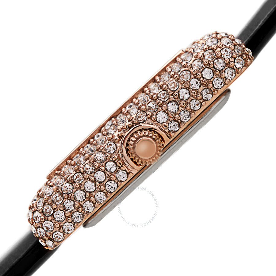 Rose gold-tone brass set (all over) with crystals with a black leather strap. Fixed rose gold-tone brass bezel set with crystals. White dial with rose gold-tone alpha-style hands and index hour markers. Dial Type: Analog. Quartz movement. Scratch resistant mineral crystal. Pull / push crown. Solid case back. Rectangle case shape. Case size: 27 mm. Case thickness: 8 mm. Band width: 18 mm. Band length: 7.5 inches. Tang clasp. Water resistant at 30 meters / 100 feet. Functions: hour, minute. Fashion watch style. Akribos XXIV White Dial Black Leather Ladies Watch AK1068BK.