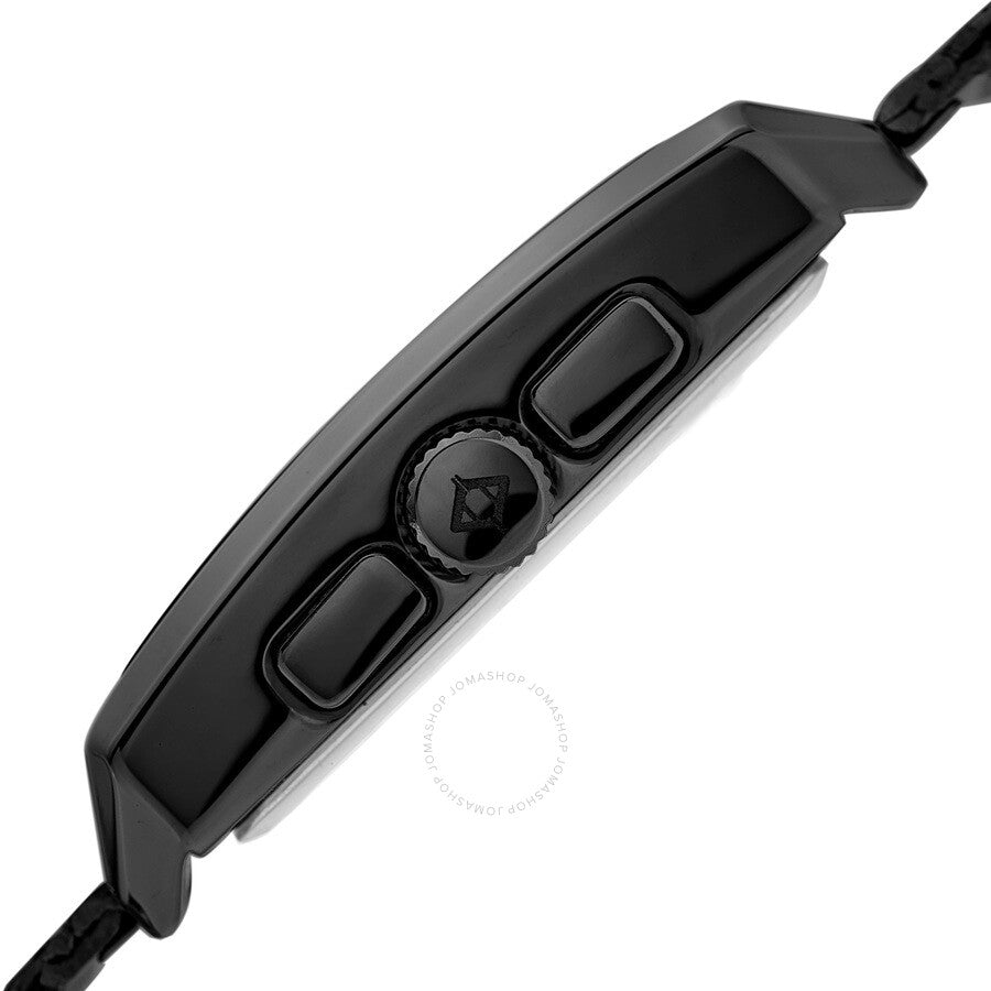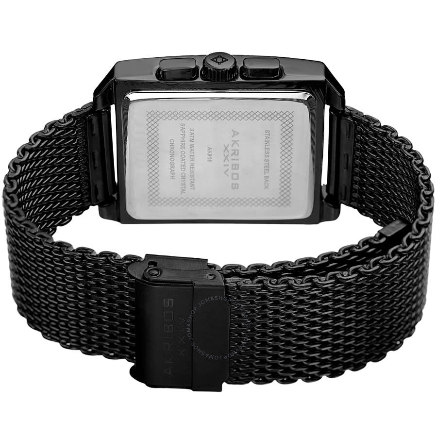 Black alloy case with a black-plated stainless steel mesh bracelet. Fixed black alloy bezel. Black dial with luminous black hands and index hour markers. Dial Type: Analog. Luminescent hands and markers. Date display between the 4 and 5 o'clock positions. Chronograph - two silver sub-dials displaying: 60 second and 30 minute. Date sub-dial. Quartz movement. Scratch resistant mineral crystal. Pull / push crown. Solid case back. Rectangle case shape. Case size: 34 mm. Case thickness: 11 mm. Band width: 22 mm. Band length: 7.5 inches. Fold over slip through clasp. Water resistant at 30 meters / 100 feet. Functions: chronograph, date, hour, minute, second. Womens Casual Series. Casual watch style. Akribos XXIV Womens Casual Chronograph Quartz Black Dial Men's Watch P50154.