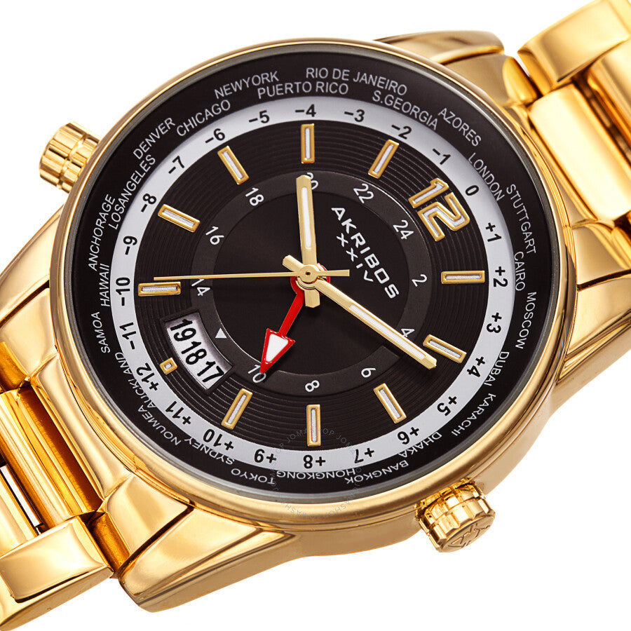 Yellow gold-tone composite metal case with a yellow gold-tone stainless steel bracelet. Fixed gold-tone bezel. Black dial with luminous yellow gold-tone hands and index hour markers. An Arabic numeral appears at the 12 o'clock position. 24 hour markers. GMT (+/-) time zone markings. World markers around the outer rim. Dial Type: Analog. Luminescent hands and markers. Date display at the 6 o'clock position. Quartz movement. Scratch resistant mineral crystal. Pull / push crown. Solid case back. Round case shape. Case size: 41 mm. Case thickness: 12 mm. Band width: 22 mm, band length: 7.5 inches. Butterfly clasp. Water resistant at 30 meters / 100 feet. Functions: dual time, world time, GMT, date, hour, minute, second. Travel watch style. Akribos XXIV World Time Quartz Black Dial Men's Watch AK1021YGB.
