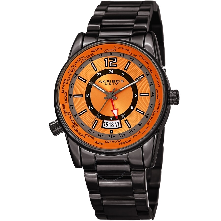 Black-plated composite metal case with a black-plated stainless steel bracelet. Fixed black-plated composite metal bezel. Orange dial with silver-tone hands and index hour markers. An Arabic numeral appears at the 12 o'clock position. GMT + / - scale. 24 hour markers. World time cities around the outer rim. Dial Type: Analog. Luminescent hands and markers. Date display at the 6 o'clock position. Quartz movement. Scratch resistant mineral crystal. Pull / push crown. Solid case back. Round case shape. Case size: 41 mm. Case thickness: 12 mm. Band width: 22 mm. Band length: 7.5 inches. Butterfly clasp. Water resistant at 30 meters / 100 feet. Functions: dual time, GMT, world time, date, hour, minute, second. Travel watch style. Akribos XXIV World Time Quartz Orange Dial Men's Watch AK1021GNOR.