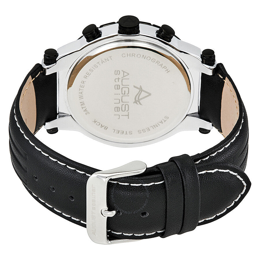 Base metal case with a black leather strap. Fixed base metal bezel. Silver dial with luminous black hands and index hour markers. Minute markers. Tachymeter markings around the outer rim. Dial Type: Analog. Luminescent hands and markers. Date display between the 4 and 5 o'clock positions. Chronograph - three sub-dials displaying: 60 second, 60 minute and 24 hour. Quartz movement. Scratch resistant mineral crystal. Pull / push crown. Screw down case back. Case size: 44 mm. Case thickness: 10 mm. Round case shape. Band width: 24 mm. Band length: 9 inches. Tang clasp. Water resistant at 30 meters / 100 feet. Functions: chronograph, tachymeter, date, hour, minute, second. Additional Info: subdials: three, 24 hour, 60 second and 60 minute timer. Casual watch style. August Steiner Chronograph Silver Dial Men's Watch AS8085SS.