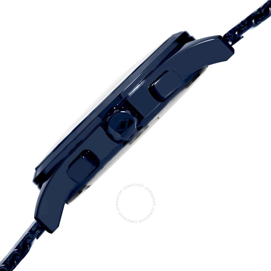 Blue-plated stainless steel case with a blue-plated stainless steel mesh bracelet. Fixed blue-plated stainless steel bezel. Black dial with luminous blue dauphine-style hands and index hour markers. Minute markers. Tachymeter markings around the outer rim. Dial Type: Analog. Luminescent hands. Date display at the 3 o'clock position. Three sub-dials displaying: 60 second, 12 hour and 24 hour. Quartz movement. Scratch resistant mineral crystal. Pull / push crown. Solid case back. Round case shape, case size: 42 mm, case thickness: 11 mm. Band width: 22 mm, band length: 7.5 inches. Fold over clasp. Water resistant at 30 meters / 100 feet. Functions: date, GMT, second time zone, hour, minute, second. Fashion watch style. August Steiner Quartz Black Dial Men's Watch AS8194BU.