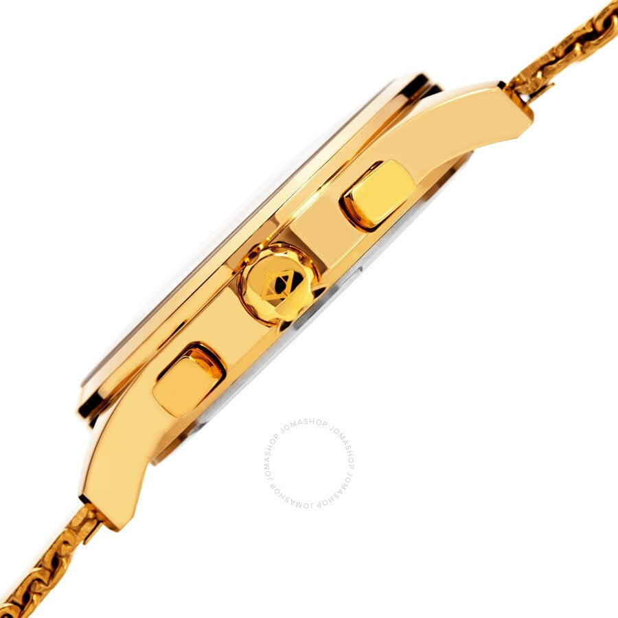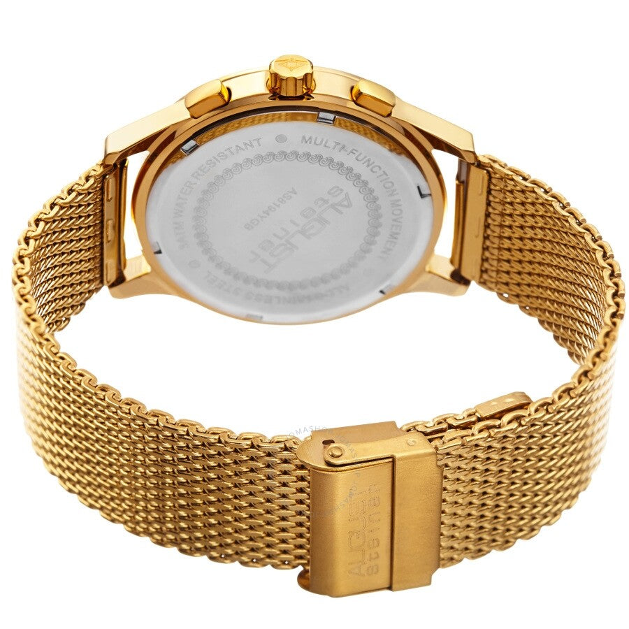 Gold-tone stainless steel case with a gold-tone stainless steel mesh bracelet. Fixed gold-tone bezel. Black dial with gold-tone dauphine-style hands and index hour markers. Minute markers. Tachymeter markings around the outer rim. Dial Type: Analog. Luminescent hands. Date display at the 3 o'clock position. Three multi-function sub-dials displaying: month, day of the week and 24 hour (GMT). Quartz movement. Scratch resistant mineral crystal. Pull / push crown. Solid case back. Round case shape. Case size: 42 mm. Case thickness: 11 mm. Band width: 22 mm. Band length: 7.5 inches. Fold over slip through clasp. Water resistant at 30 meters / 100 feet. Functions: month, date, day, GMT, second time zone, hour, minute, second. Fashion watch style. August Steiner Quartz Black Dial Men's Watch AS8194YGB.