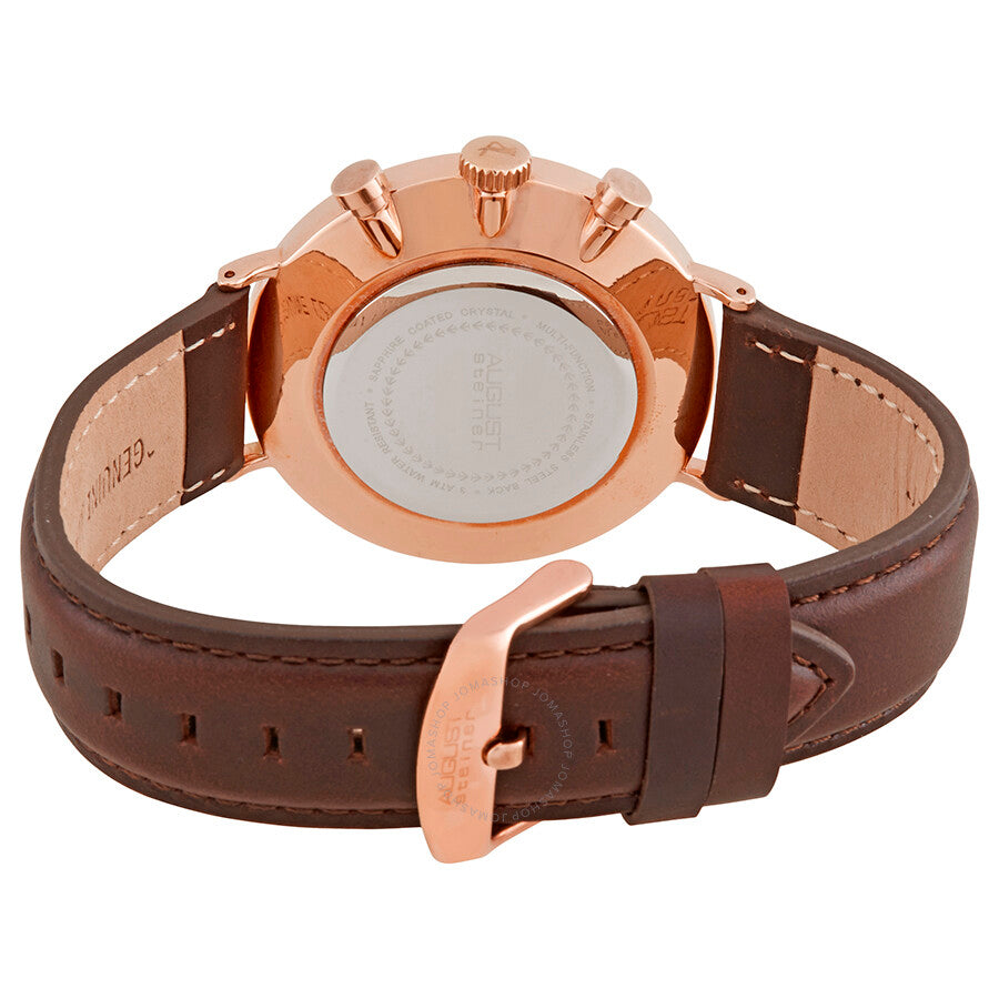 Rose gold-tone alloy case with a brown leather strap. Fixed rose gold-tone bezel. Black dial with rose gold-tone hands and index hour markers. Roman Nnmerals appear at the 3, 6, 9 and 12 o'clock positions. Minute markers around the outer rim. Dial Type: Analog. Date display at the 3 o'clock position. Three multi-function sub-dials displaying: day of the week, month, and 24 hours. Quartz movement. Scratch resistant sapphire-coated mineral crystal. Pull / push crown. Solid case back. Round case shape. Case size: 44 mm. Case thickness: 9 mm. Band width: 20 mm. Tang clasp. Water resistant at 30 meters / 100 feet. Functions: date, hour, minute, second. Casual watch style. August Steiner Quartz Black Dial Men's Watch AS8212RGB.