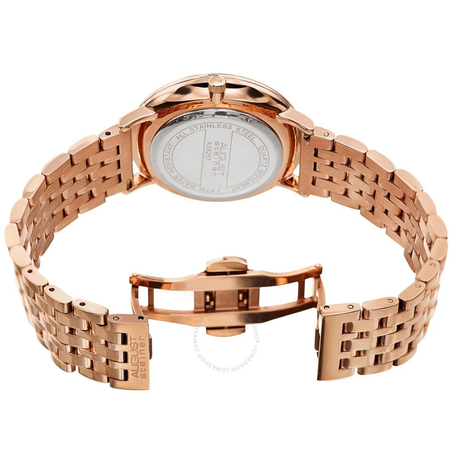 Rose gold-tone stainless steel case and bracelet. Fixed rose gold-tone bezel. Blue dial with rose gold-tone leaf-style hands and Arabic numeral hour markers. Minute markers around an inner ring. Dial Type: Analog. Date display above the 6 o'clock position. Quartz movement. Scratch resistant mineral crystal. Pull / push crown. Solid case back. Round case shape. Case size: 40 mm. Case thickness: 9.7 mm. Band width: 22 mm, band length: 8 inches. Butterfly clasp. Water resistant at 30 meters / 100 feet. Functions: date, hour, minute, second. Fashion watch style. August Steiner Quartz Blue Dial Men's Watch AS8257RGBU.