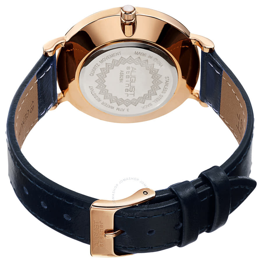Rose gold-tone composite metal case with a blue leather strap. Fixed rose gold-tone composite metal bezel. White dial with rose gold-tone hands and index hour markers. Minute markers around the outer rim. Dial Type: Analog. Quartz movement. Scratch resistant Hardlex crystal. Pull / push crown. Solid case back. Round case shape. Case size: 40 mm. Case thickness: 9 mm. Band width: 18 mm. Tang clasp. Water resistant at 30 meters / 100 feet. Functions: hour, minute, second. Casual watch style. August Steiner Quartz White Dial Men's Watch AS8284RGBU.