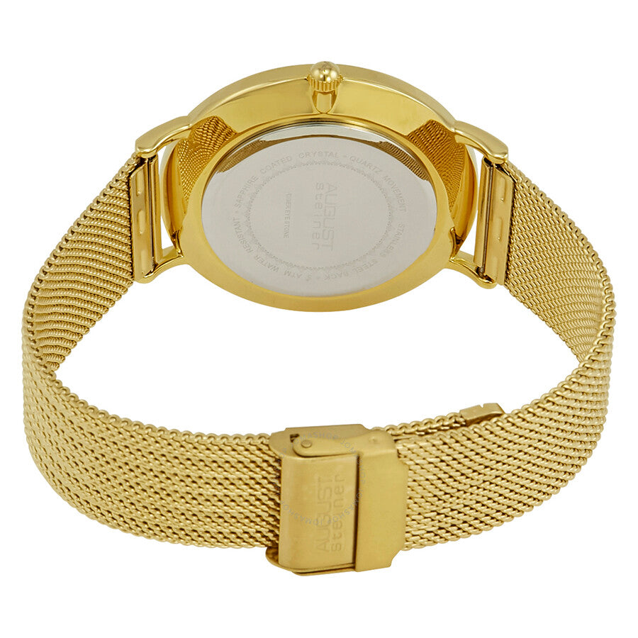 Gold-tone alloy case with a gold-tone stainless steel mesh bracelet. Fixed gold-tone alloy bezel. Orange (tiger eye stone) dial with gold-tone hands and index hour markers. Roman numerals appear at the 6 and 12 o'clock positions. Dial Type: Analog. Quartz movement. Scratch resistant sapphire-coated mineral crystal. Pull / push crown. Solid case back. Round case shape. Case size: 44 mm. Case thickness: 8 mm. Band width: 22 mm. Fold over slip through clasp. Water resistant at 30 meters / 100 feet. Functions: hour, minute. Urbane Series. Casual watch style. Watch label: Japan Movt. August Steiner Urbane Orange Dial Men's Watch AS8218YG.