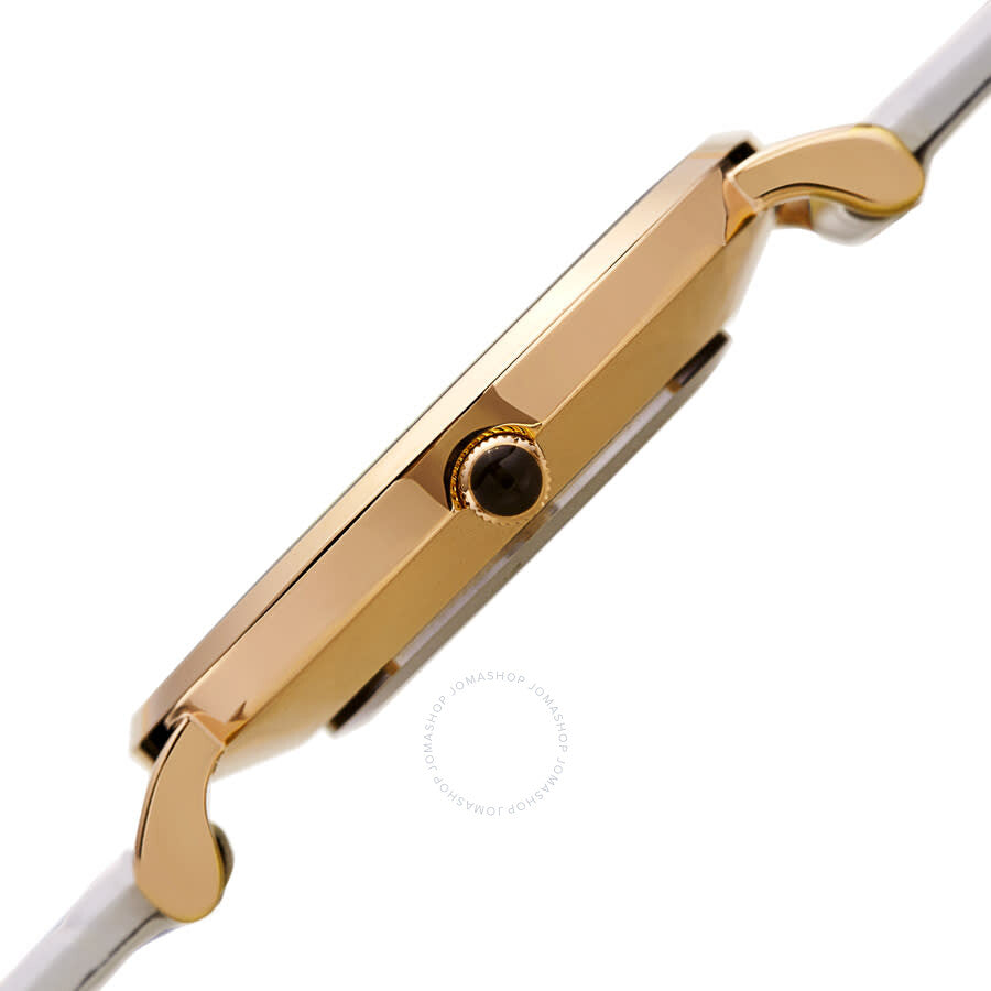 Gold-tone composite metal case with a white leather strap. Fixed gold-tone composite metal bezel. White dial with blue leaf-style shape hands and baguette crystal hour markers. Dial Type: Analog. Quartz movement. Scratch resistant hardlex crystal. Pull / push crown. Solid case back. Round case shape. Case size: 36 mm. Case thickness: 7.4 mm. Band width: 16 mm. Tang clasp. Water resistant at 30 meters / 100 feet. Functions: hour, minute. Casual watch style. August Steiner Quartz White Dial Ladies Watch AS8287WT.
