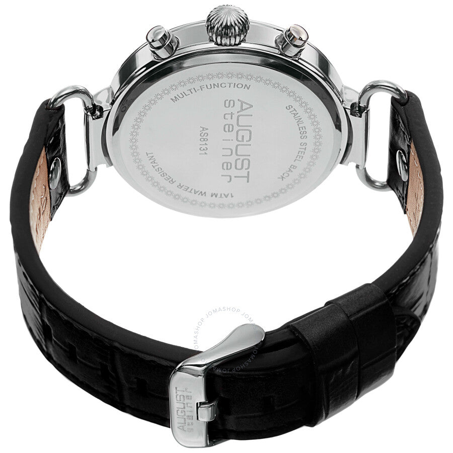 Silver-tone composite metal case with a black leather strap. Fixed silver-tone composite metal bezel. Black dial with silver-tone sword-shaped hands and index hour markers. Arabic numerals appear at the 3, 6, 9 and 12 o'clock positions. Arabic Numeral Minute Markers (at 5 minute intervals). Arabic numeral minute markers (at 5 minute intervals). Minute markers around the outer rim. Dial Type: Analog. Luminescent hands. Date display at the 3 o'clock position. Three multi-function sub-dials displaying: date, day of the week and 24 hour. Quartz movement. Scratch resistant mineral crystal. Pull / push crown. Solid case back. Round case shape. Case size: 45 mm. Case thickness: 13 mm. Band width: 20 mm. Band length: 8.5 inches. Tang clasp. Water resistant at 10 meters / 33 feet. Functions: date, day, GMT, second time zone, hour, minute, second. Fashion watch style. Watch label: Swiss Movt. August Steiner Black Dial Black Leather Men's Watch AS8131SSB.