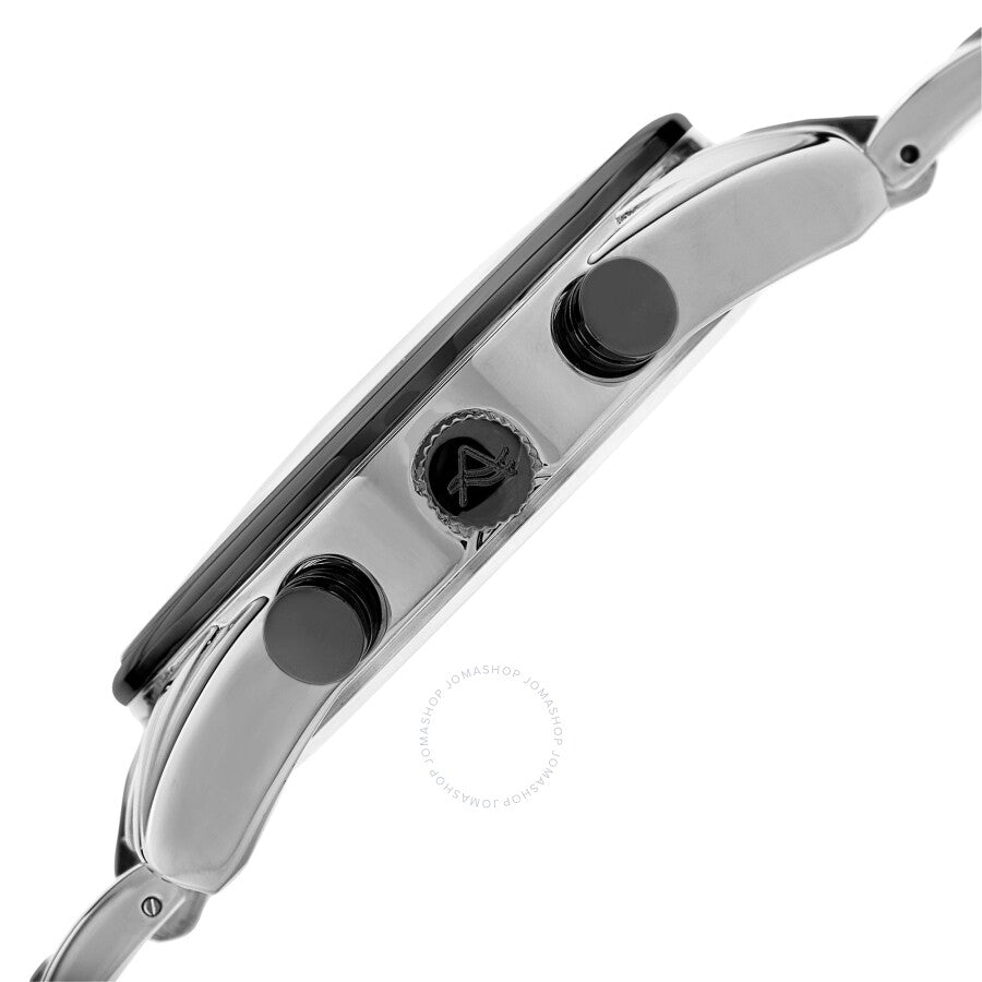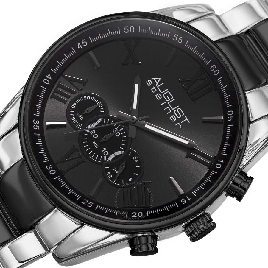 Silver-tone composite metal case with a two-tone (black-plated and silver-tone) stainless steel bracelet. Fixed black-plated composite metal bezel. Black dial with luminous black pencil-style hands and alternating Roman numeral and index hour markers. Minute markers around the outer rim. Dial Type: Analog. Luminescent hands. Chronograph - three sub-dials displaying: 60 second, 30 minute and 24 hour. Quartz movement. Scratch resistant mineral crystal. Pull / push crown. Solid case back. Round case shape. Case size: 45 mm. Case thickness: 13 mm. Band width: 24 mm. Band length: 8 inches. Fold over clasp. Water resistant at 10 meters / 33 feet. Functions: chronograph, GMT, hour, minute, second. Fashion watch style. August Steiner Chronograph Quartz Black Dial Men's Watch AS8163TTB.