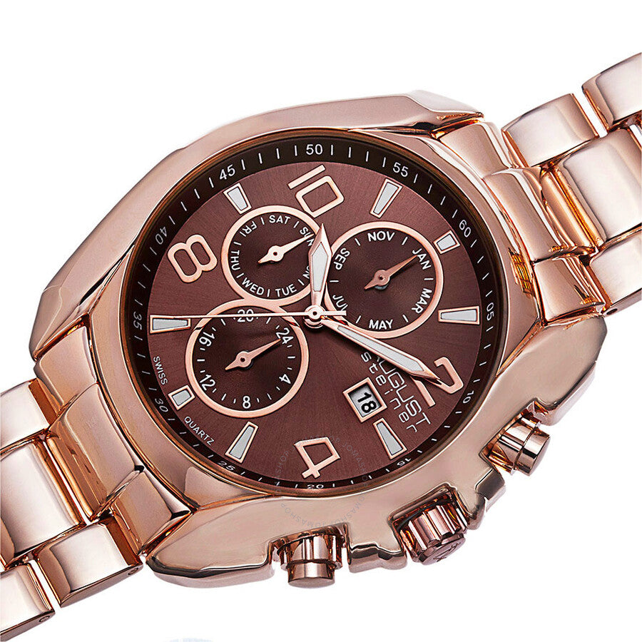 Rose gold-tone base metal case with a rose gold-tone base metal bracelet. Fixed rose gold-tone base metal bezel. Brown dial with luminous rose gold-tone hands and alternating Arabic numeral and index hour markers. Arabic numeral minute markers (at 5 minute intervals). Minute markers around the outer rim. Dial Type: Analog. Luminescent hands and batons. Date display at the 3 o'clock position. Three multi-function sub-dials displaying: month, day of the week and 24 hour. Quartz movement. Scratch resistant mineral crystal. Pull / push crown. Solid case back. Round case shape. Case size: 43 mm. Case thickness: 13 mm. Band width: 22 mm. Band length: 9 inches. Fold over clasp with a double push button release. Water resistant at 10 meters / 33 feet. Functions: month, date, day, GMT, second time zone, hour, minute, second. Additional Info: month, day and GMT. Casual watch style. Watch label: Swiss Quartz. August Steiner Multi-Function Brown Dial Men's Watch AS8109RG.