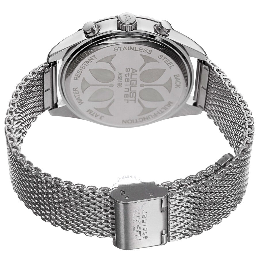 Silver-tone composite metal case with a stainless steel mesh bracelet. Fixed fluted silver-tone composite metal bezel. Blue dial with luminous silver-tone hands and index hour markers. Arabic numerals appear at the 4, 8 and 12 o'clock positions. Minute markers around the outer rim. Dial Type: Analog. Luminescent hands and markers. Three multi-function sub-dials displaying: date, day of the week and 24 hour. Quartz movement. Scratch resistant mineral crystal. Pull / push crown. Solid case back. Round case shape. Case size: 42 mm. Case thickness: 12 mm. Band width: 20 mm. Band length: 7 inches. Fold over slip through clasp. Water resistant at 30 meters / 100 feet. Functions: date, day, GMT, second time zone, hour, minute, second. Fashion watch style. August Steiner Quartz Blue Dial Men's Watch AS8196SSBU.