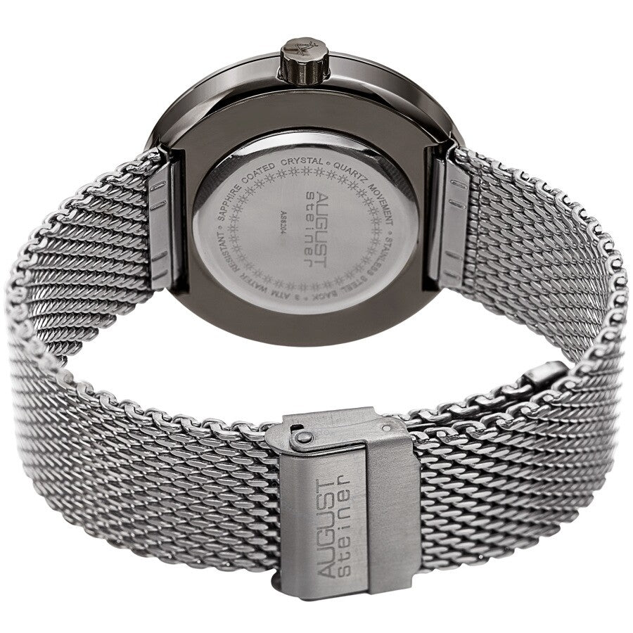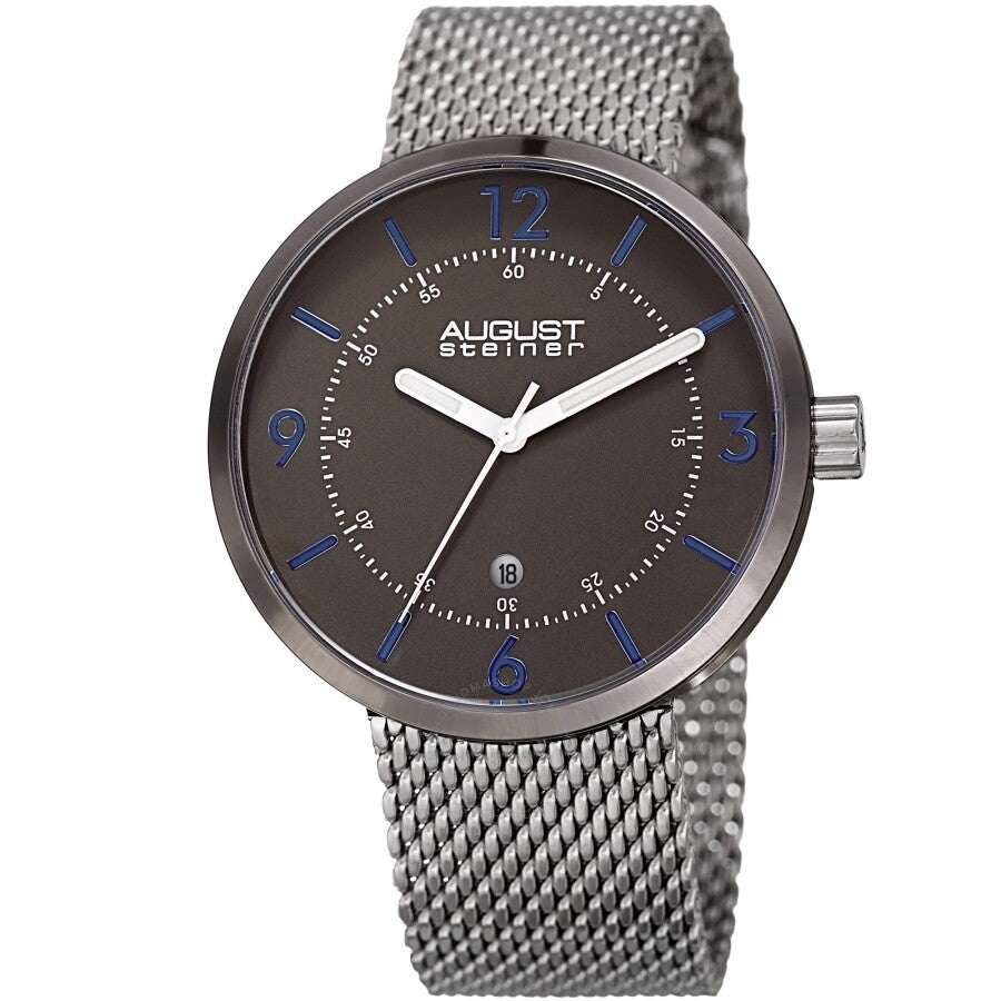 Grey-plated composite metal case with a silver-tone stainless steel mesh bracelet. Fixed grey-plated composite metal bezel. Grey dial with luminous silver-tone hands and index hour markers. Arabic numerals appear at the 3, 6, 9 and 12 o'clock positions. Arabic numeral minute markers (at 5 minute intervals). Minute markers around an inner ring. Dial Type: Analog. Luminescent hands and markers. Date display at the 6 o'clock position. Quartz movement. Scratch resistant mineral crystal. Pull / push crown. Solid case back. Round case shape. Case size: 42 mm. Case thickness: 12 mm. Band width: 22 mm. Band length: 7.5 inches. Fold over slip through clasp. Water resistant at 30 meters / 100 feet. Functions: date, hour, minute, second. Fashion watch style. August Steiner Quartz Grey Dial Silver-tone Mesh Men's Watch AS8204SSGN.