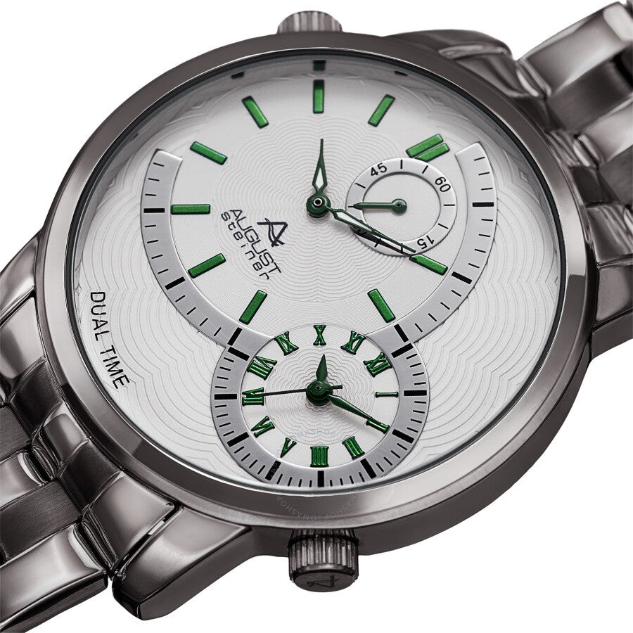 Silver-tone composite metal case with a stainless steel bracelet. Fixed silver-tone composite metal bezel. White (dual time) dial with green alpha-style hands and index hour markers. Minute markers around the outer rim. Dial Type: Analog. Luminescent hands. Small seconds sub-dial. Quartz movement. Scratch resistant mineral crystal. Pull / push crown. Solid case back. Round case shape. Case size: 44 mm. Case thickness: 9 mm. Band width: 22 mm, band length: 8 inches. Fold over clasp. Water resistant at 30 meters / 100 feet. Functions: second time zone, hour, minute, small second. Dual Time Series. Fashion watch style. August Steiner Quartz White Dial Stainless Steel Men's Watch AS8210GN.