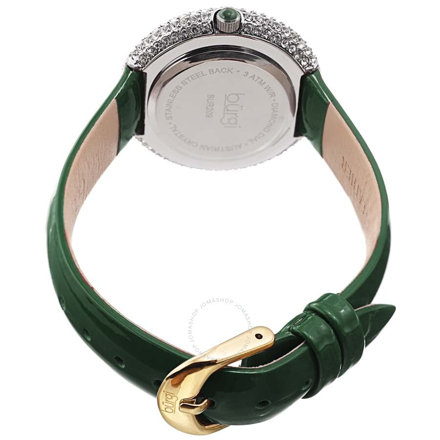 Silver-tone brass w/ swarovski crystals case with a green patent leather strap. Fixed gold-tone bezel with crystal set. White dial with gold-tone dauphine-style shape hands. Dial Type: Analog. Quartz movement. Scratch resistant mineral with hardened coating crystal. Push/pull crown. Solid case back. Round case shape, case size: 36 mm, case thickness: 8.2 mm. Band width: 14 mm, band length: 7 inches. Pin buckle clasp. Water resistant at 30 meters / 100 feet. Functions: hour, minute, second. Swirl Series. Dress watch style. Burgi Swirl Quartz Crystal White Dial Ladies Watch BUR209GN.