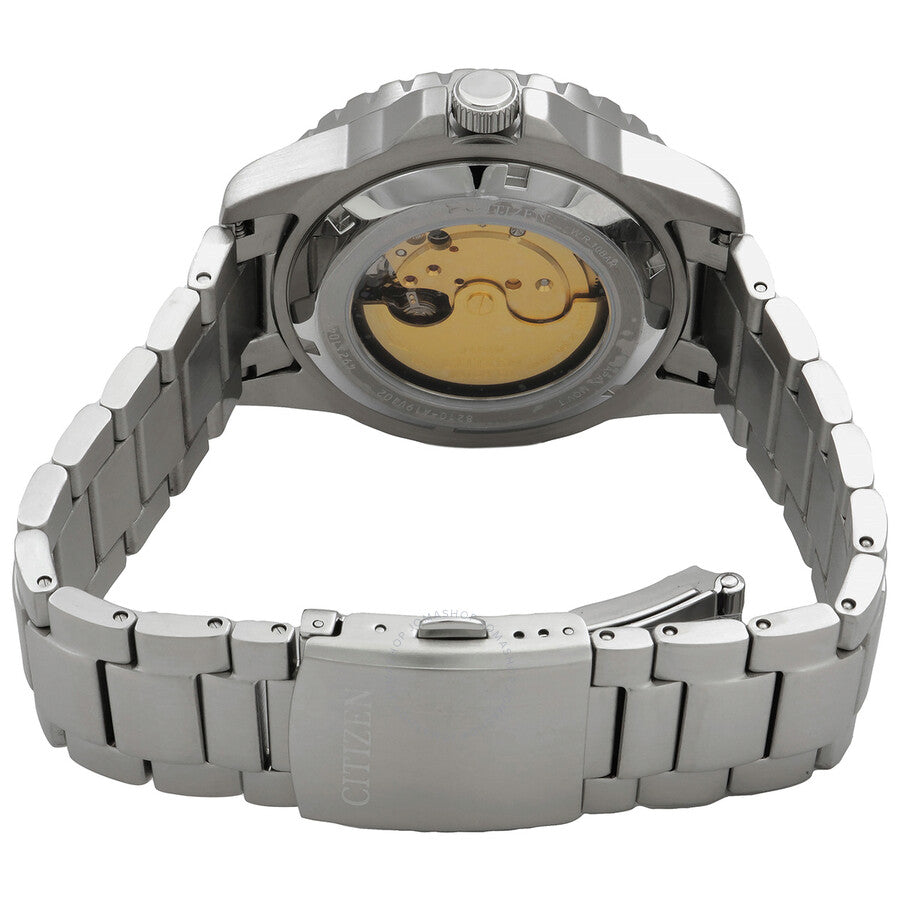 Silver-tone stainless steel case and bracelet. Blue stainless steel bezel. Blue dial with blue hands and index hour markers. Minute markers around the outer rim. Dial Type: Analog. Date display at the 3 o'clock position. Citizen Caliber 8210 Automatic movement, containing 21 Jewels, bitting at 21600 vph, and has a power reserve of approximately 45 hours. Scratch resistant mineral crystal. Transparent see through case back. Round case shape, case size: 43 mm, case thickness: 12.4 mm. Deployment with push button release clasp. Water resistant at 100 meters / 330 feet. Functions: date, hour, minute, second. Casual watch style. Watch label: Japan Movt. Citizen Automatic Blue Dial Men's Watch NJ0178-81M.