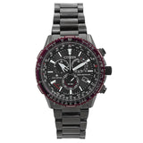 Black stainless steel case and bracelet. Bi-directional rotating burgundy stainless steel bezel. Black dial with silver-tone hands and index hour markers. Minute markers around the outer rim. Dial Type: Analog. Luminescent hands and markers. Date display at the 4 o'clock position. Three sub-dials displaying: 24 hour, day/60 second/power reserve indicator , mode. Citizen Caliber E660 eco-drive movement. Scratch resistant sapphire crystal. Screw down crown. Solid case back. Round case shape, case size: 46 mm, case thickness: 13.7 mm. Fold over clasp with a safety release. Water resistant at 200 meters / 660 feet. Functions: perpetual calendar, atomic timekeeping, radio controlled, chronograph, world time, alarm, date, day, GMT, second time zone, hour, minute, second, power reserve indicator, solar-powered. Promaster Series. Sport watch style. Watch label: Japan Movt. Citizen Promaster Perpetual Alarm World Time Chronograph GMT Black Dial Men's Watch CB5009-55E.
