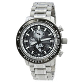 Silver-tone stainless steel case and bracelet. Bi-directional rotating black stainless steel bezel. Grey dial with luminous hands and index-Arabic numeral hour markers. Minute markers around the outer rim. Dial Type: Analog. Luminescent hands and markers. Date display at the 4 o'clock position. Three-am-pm/24 hour,world time and day subdials. Citizen Caliber H864 eco-drive movement. Scratch resistant sapphire crystal. Solid case back. Round case shape, case size: 46 mm. Fold over clasp with a safety release. Water resistant at 200 meters / 660 feet. Functions: date, hour, minute, second,power reserve indication,antimagnetic,world time,. Promaster Series. Sport watch style. Watch label: Japan Movt. Citizen Promaster World Time Grey Dial Men's Watch BY3006-53H.