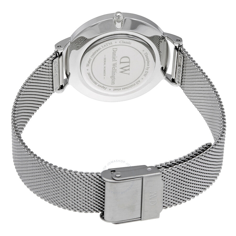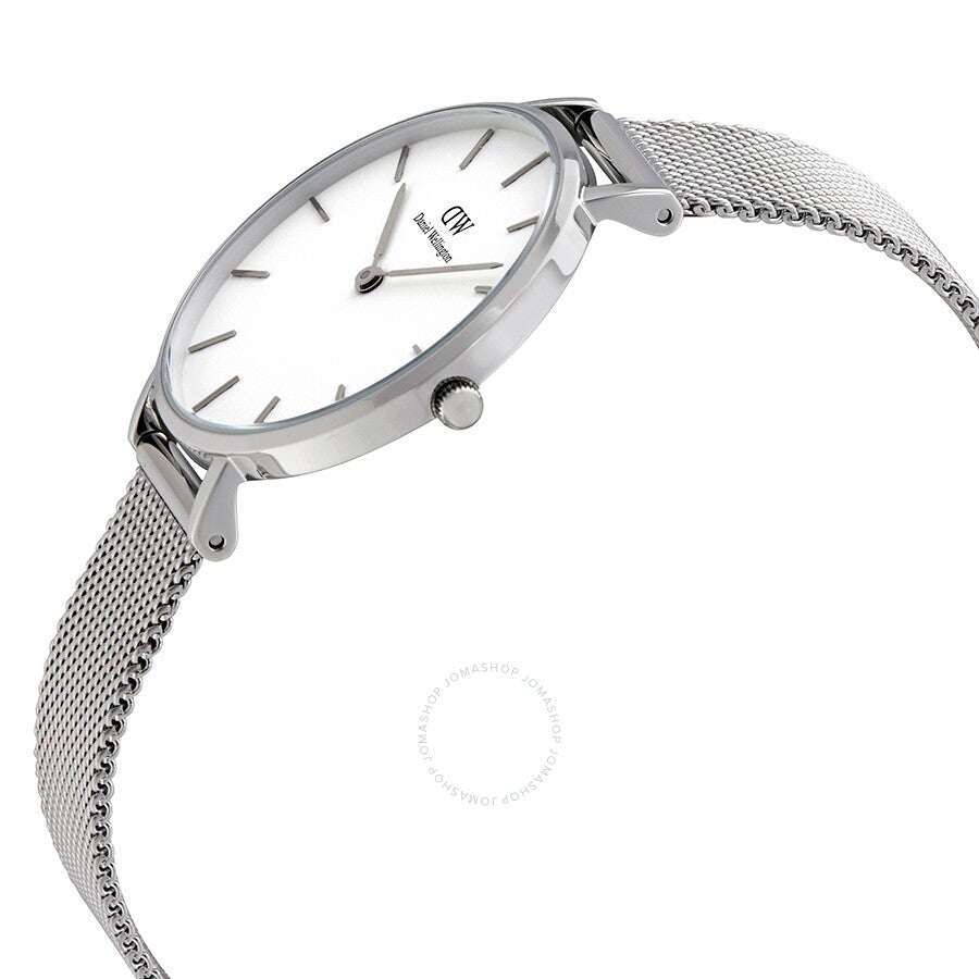Stainless steel case with a stainless steel mesh bracelet. Fixed stainless steel bezel. Eggshell white dial with silver-tone hands and index hour markers. Dial Type: Analog. Miyota GL20 quartz movement. Scratch resistant mineral crystal. Pull / push crown. Solid case back. Round case shape. Case size: 32 mm. Case thickness: 6 mm. Band width: 14 mm. Fold over slip through clasp. Water resistant at 30 meters / 100 feet. Functions: hour, minute,. Classic Petite Sterling Series. Casual watch style. Daniel Wellington Classic Petite Sterling Ladies Watch DW00100164.