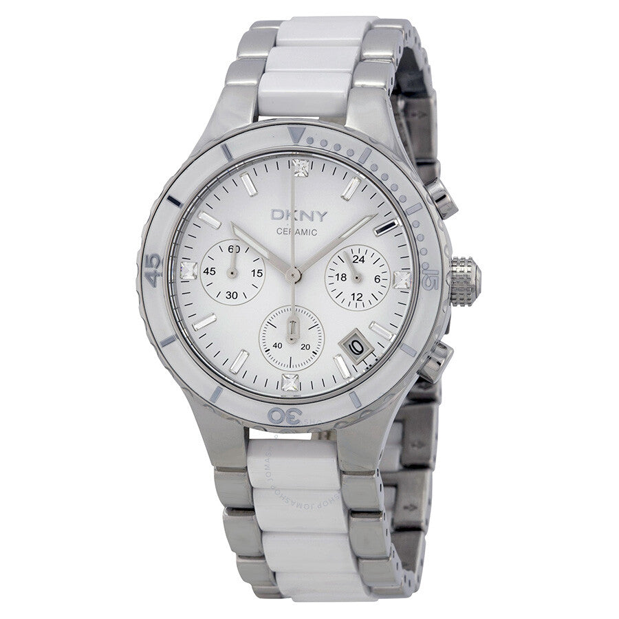 Stainless steel case with a stainless steel bracelet with white ceramic center links. Fixed silver-tone bezel with white ceramic top ringl. White dial with silver-tone hands and crystal index hour markers. Minute markers around the outer rim. Dial Type: Analog. Luminescent hands. Date display between 4 and 5 o'clock position. Chronograph - three sub-dials displaying: 60 second, 60 minute and 24 hour. Quartz movement. Scratch resistant mineral crystal. Pull / push crown. Solid case back. Case diameter: 38 mm. Case thickness: 13 mm. Round case shape. Band width: 20 mm. Deployment clasp. Water resistant at 50 meters / 165 feet. Functions: chronograph, date, hour, minute, second. Casual watch style. DKNY Chronograph Wite Dial Steel and Ceramic Bracelet Ladies Watch NY8502.