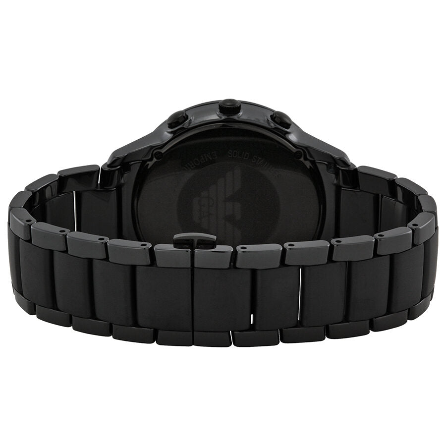 Black ceramic case with a black ceramic bracelet. Fixed black ceramic bezel. Black dial with luminous silver-tone alpha-style shape hands and index hour markers. Emporio armani logo marks the 12 o'clock position. minute markers around the outer rim. Dial Type: Analog. Luminescent hands and markers. Date display between the 4 and 5 o'clock positions. Chronograph - three sub-dials displaying: 60 second, 60 minute and 24 hour. Quartz movement. Scratch resistant mineral crystal. Pull / push crown. Solid case back. Round case shape, case size: 47 mm, case thickness: 12.5 mm. Band width: 24 mm. Deployment clasp. Water resistant at 30 meters / 100 feet. Functions: chronograph, date, hour, minute, second. Casual watch style. Emporio Armani Ceramica Chronograph Black Dial Men's Watch AR1451.