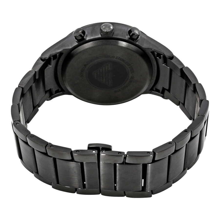 Black ion-plated stainless steel case and bracelet. Fixed black ion-plated bezel. Black dial with black hands and index hour markers. Minute markers around the outer rim. The Emporio Armani logo appears at the 12 o'clock position. Dial Type: Analog. Date display between the 4 and 5 o'clock positions. Chronograph - three sub-dials displaying: 60 second, 60 minute and 24 hours. Quartz movement. Scratch resistant mineral crystal. Pull / push crown. Solid case back. Case size: 43 mm. Case thickness: 11 mm. Round case shape. Band width: 22 mm. Deployment clasp. Water resistant at 50 meters / 165 feet. Functions: chronograph, date, hour, minute, second. Dress watch style. Armani Classic Chronograph Black Dial Men's Watch AR2453.