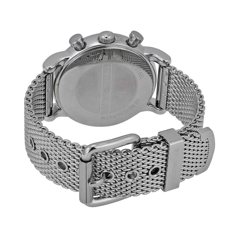 Stainless steel case with a stainless steel mesh bracelet. Fixed stainless steel bezel. Black dial with silver-tone hands and index hour markers. The Emporio Armani logo at the 12 o'clock position. Dial Type: Analog. Luminescent hands. Date display between the 4 and 5 o'clock positions. Chronograph - three sub-dials displaying: 60 second, 30 minute and 24 hour. Quartz movement. Scratch resistant mineral crystal. Pull / push crown. Case diameter: 41 mm. Case thickness: 12.3 mm. Bracelet width: 20 mm. Round case shape. Tang clasp. Water resistant at 50 meters / 165 feet. Functions: chronograph, date, hour, minute, second. Casual watch style. Emporio Armani Classic Chronograph Black Dial Steel Men's Watch AR1811.