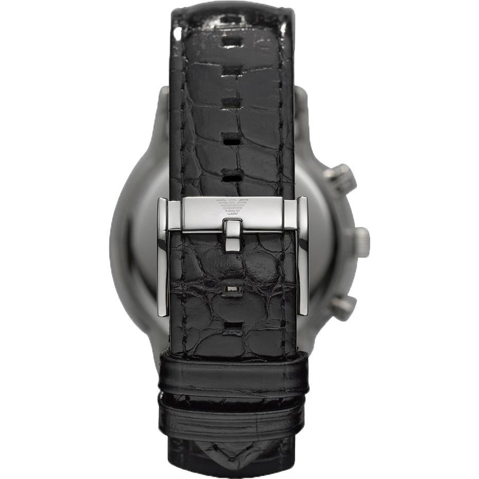 This Emporio Armani Classic Chronograph Silver Dial Men's Watch AR2432 comes in stainless steel case with a black leather strap. Fixed stainless steel bezel. Silver dial with black hands and index hour markers. The Emporio Armani logo appears at the 12 o'clock position. Minute markers around the outer rim. Dial Type: Analog. Date display appears between the 4 and 5 o'clock positions. Chronograph - three sub-dials displaying: 24 hours, 60 minutes and 60 seconds. Quartz movement. Scratch resistant mineral crystal. Pull / push crown. Solid case back. Case diameter: 43 mm. Case thickness: 12 mm. Round case shape. Band width: 22 mm. Band length: 8 inches. Tang clasp. Water resistant at 50 meters/ 165 feet. Functions: hours, minutes, seconds, chronograph, date. Fashion watch style.