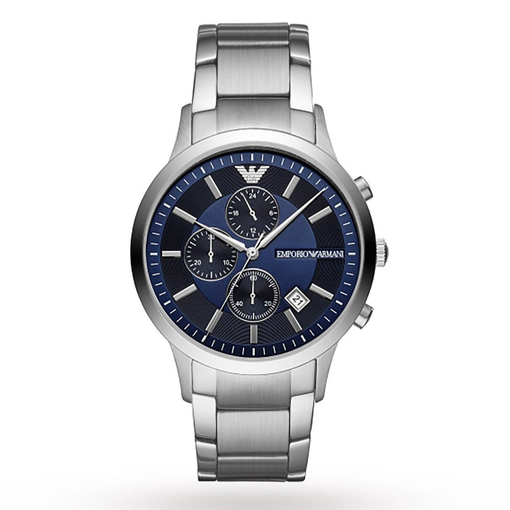 Stainless steel case with a stainless steel bracelet. Fixed stainless steel bezel. Blue dial with silver-tone hands and index hour markers. Minute markers around the outer rim. The Emporio Armani eagle appears at the 12 o'clock poisition. Dial Type: Analog. Date display between the 4 and 5 o'clock positions. Chronograph - three sub-dials displaying: 60 second, 30 minute and 24 hours. Quartz movement. Scratch resistant mineral crystal. Pull / push crown. Solid case back. Round case shape. Case size: 43 mm. Case thickness: 11 mm. Band width: 22 mm. Deployment clasp with a push button release. Water resistant at 50 meters / 165 feet. Functions: chronograph, date, hour, minute, second. Casual watch style. Watch label: Japan Movt. Emporio Armani ReNATO Chronograph Quartz Blue Dial Men's Watch AR11164.