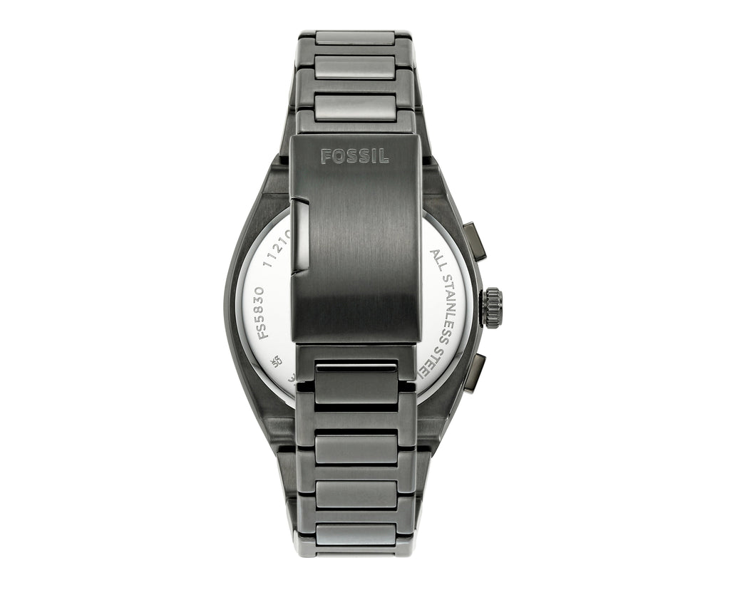 Gunmetal-plated stainless steel case and bracelet. Fixed gunmetal-plated bezel. Grey dial with luminous silver-tone hands and index hour markers. Arabic numeral minute markers (at 5 minute intervals). Minute markers around the outer rim. Dial Type: Analog. Luminescent hands and markers. Date display at the 3 o'clock position. Chronograph - three sub-dials displaying: 60 second, 30 minute and 12-24 hours. Quartz movement. Scratch resistant mineral crystal. Solid case back. Round case shape. Case size: 42 mm. Case thickness: 11 mm. Band width: 18 mm. Fold over clasp with a push button release. Water resistant at 50 meters / 165 feet. Functions: chronograph, date, hour, minute, second. Everett Series. Casual watch style. Fossil Everett Chronograph Quartz Grey Dial Men's Watch FS5830.